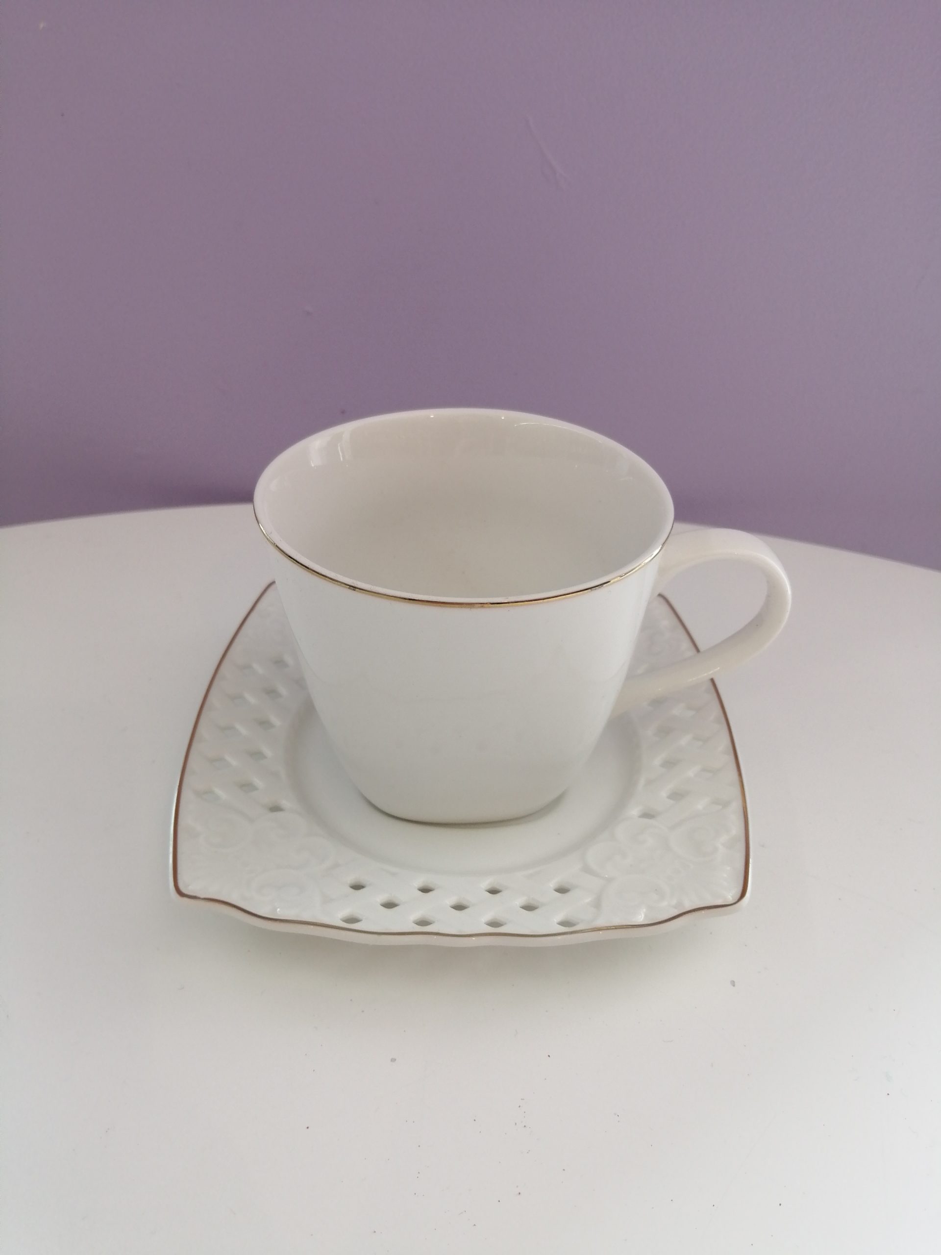 Lazar to unikatowe porcelanowe filiżanki i fantazyjne kwadratowe spodki, misternie zdobione ażurowym wzorem oraz plecionką.