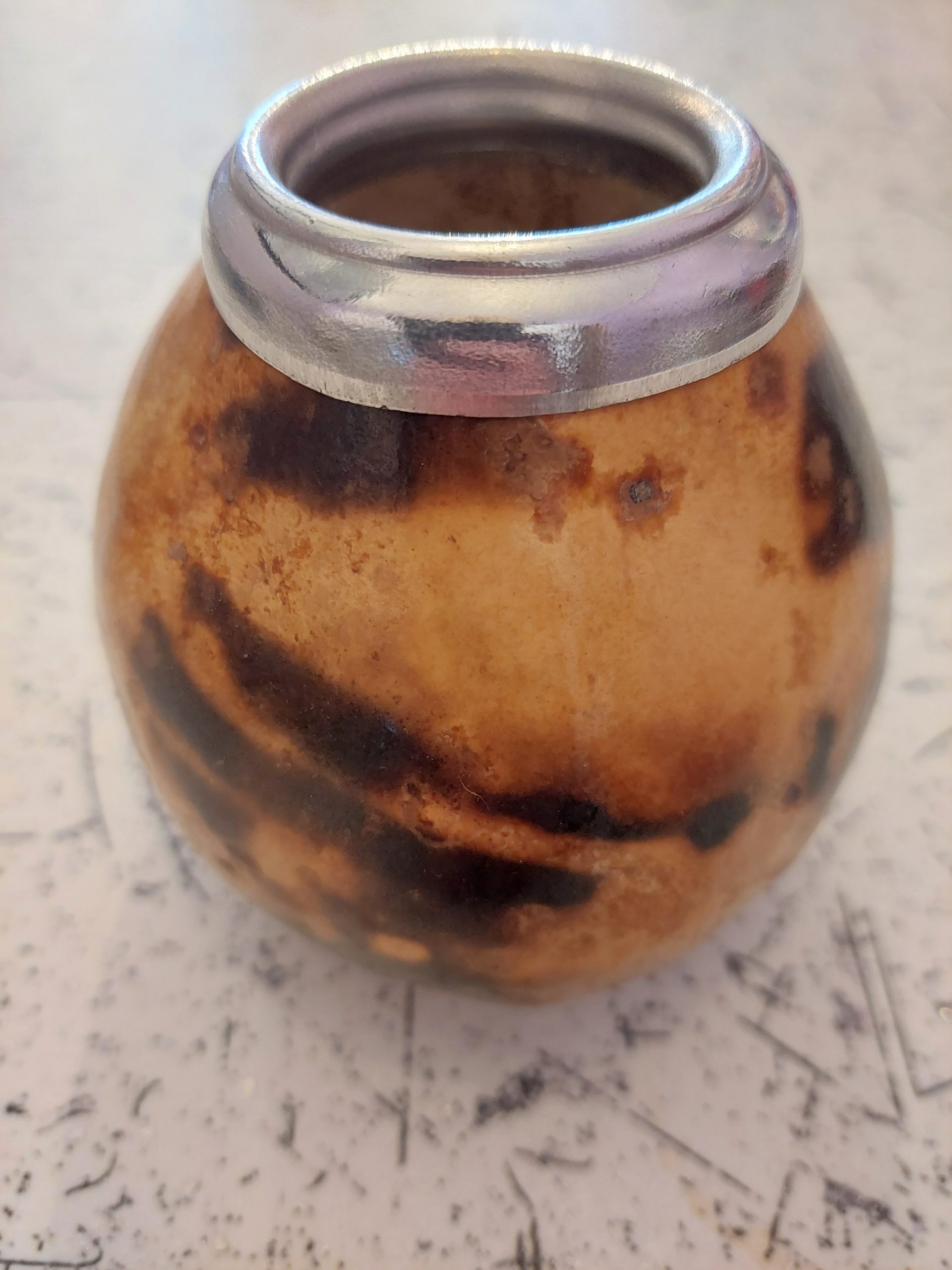 Tykwa okuta w górnej części aluminiową  virollą. Naczynie jest barwione termicznie i polerowane.